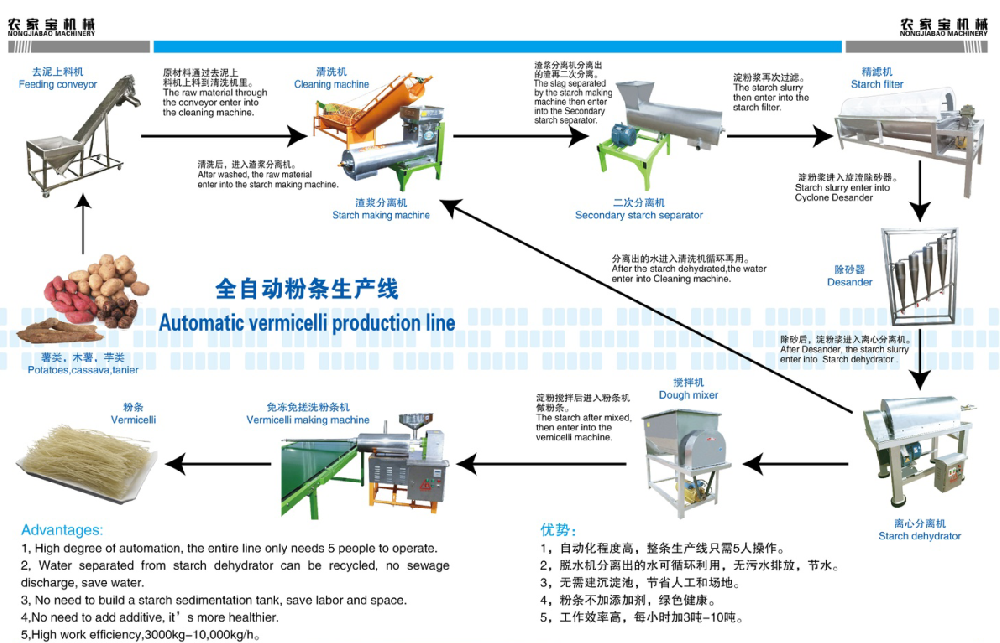 鮮薯——清洗——破碎——A型過(guò)濾機(jī)(粗濾)——除沙——B型過(guò)濾機(jī)(精濾)——沉淀——粉絲——成型——冷卻——晾曬——包裝。